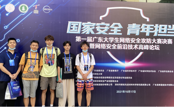 10月17日,由共青团广东省委员会、广东省教育厅、广东省科学技术厅、广东省科学技术协会、广东省学生联合会主办的“第一届广东大学生网络安全攻防大赛决赛”在广东技术师范大学举办。本次赛事于2021年上半年进行线上初赛,产生了29支晋级决赛的队伍。网安学院CS-GOAT团队杀入了决赛。团队成员翟文耀、孙圣杰、蔡泰民、张志航在罗达、何凯老师的指导下披荆斩棘,在本次决赛中斩获二等奖。