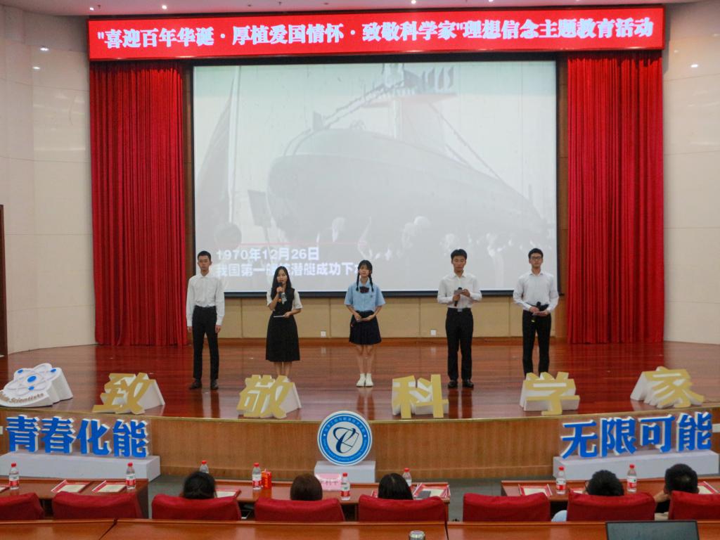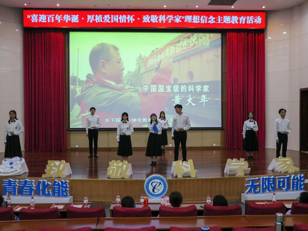 “一件件大国重器的成功研制,撑起了中华民族伟大复兴的坚强脊梁!”罗舒雯、叶小亚、陈子豪等八名学生代表表演了朗诵节目《干惊天动地事、做隐姓埋名人》。一句句慷慨激昂的朗诵词,道出了万千学子对科学家的敬仰之意。