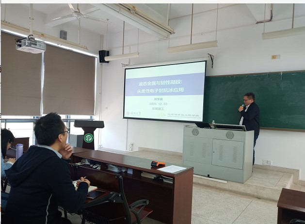 12月4日,深圳大学周学昌教授为材料科学与工程学院师生作了《液态金属与韧性凝胶:从柔性电子到抗冰界面应用》的学术报告。报告由材料科学与工程学院高分子系巫运辉老师主持,学院专任老师、博士后及部分研究生参加。