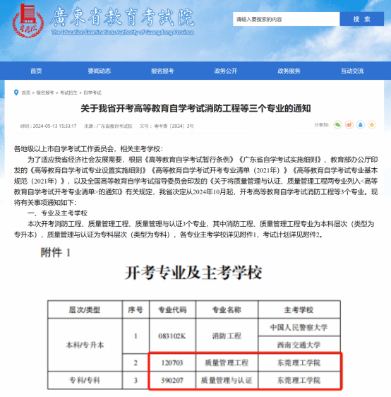 5月13日,广东省教育考试院发布《关于我省开考高等教育自学考试消防工程等三个专业的通知》(粤考委〔2024〕3号)(下称《通知》),其中我校获批新增质量管理工程(专升本)、质量管理与认证(专科)两个高等教育自学考试主考专业,并于2024年10月开考。
