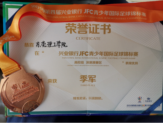 本学期初,我校足球队利用周末时间赴深圳龙岗参加了2019年JFC青少年国际足球锦标赛。为了这次比赛,足球队师生利用暑假时间回校集训。功夫不负有心人,我校足球队分别在小组赛以1-0绝杀深职院一队,3-0完胜港校联队,3-1战胜广东医科大学,以小组赛三连胜昂首出线,八强赛3-0完胜香港大学PGSA进入半决赛,最终获得本届赛事季军。