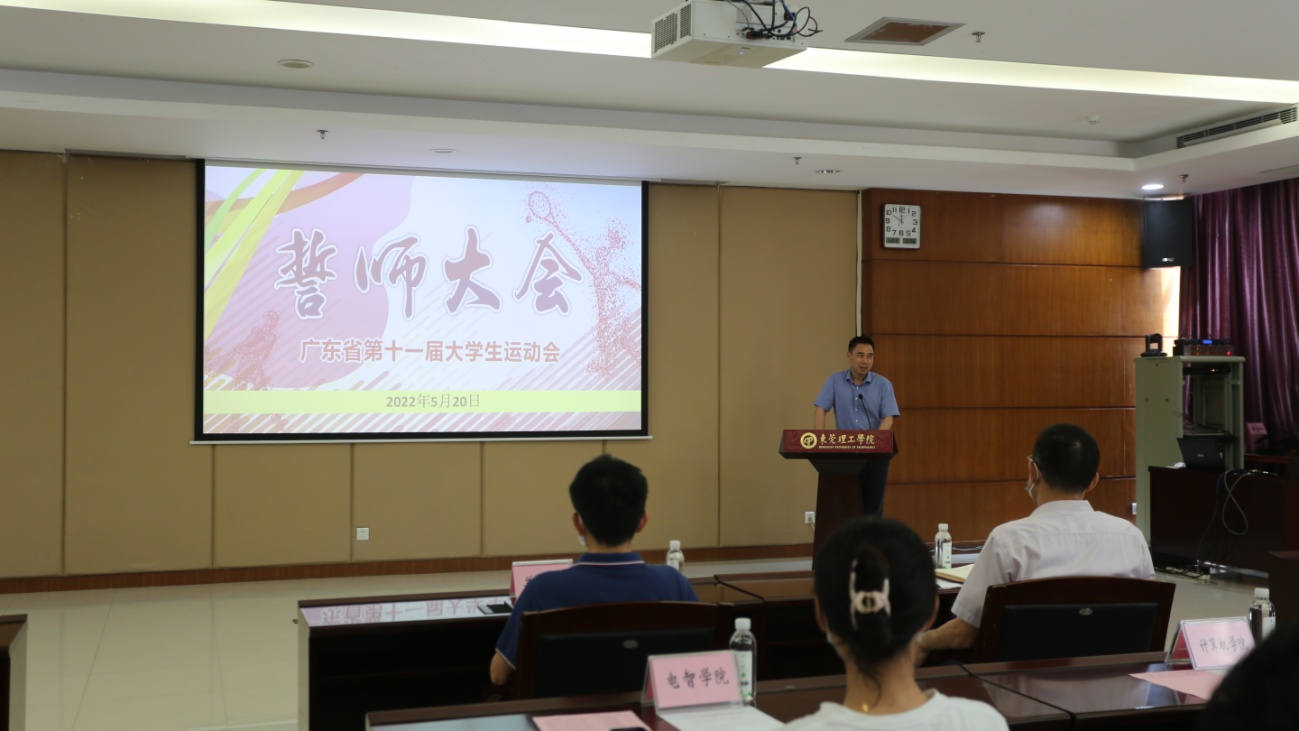 5月20日上午,广东省第十一届大学生运动会誓师大会在学术会议中心举行。我校代表团团长、副校长杨敏林,教务处处长兰善红,参赛运动员所在学院领导、运动员代表以及教练员代表共50余人参加大会。大会由代表团副团长、教育学院(师范学院)院长余意主持。代表团秘书长、教育学院(师范学院)副院长陈进介绍了代表团组团参赛备战情况。运动员、教练员代表分别作出征宣誓。