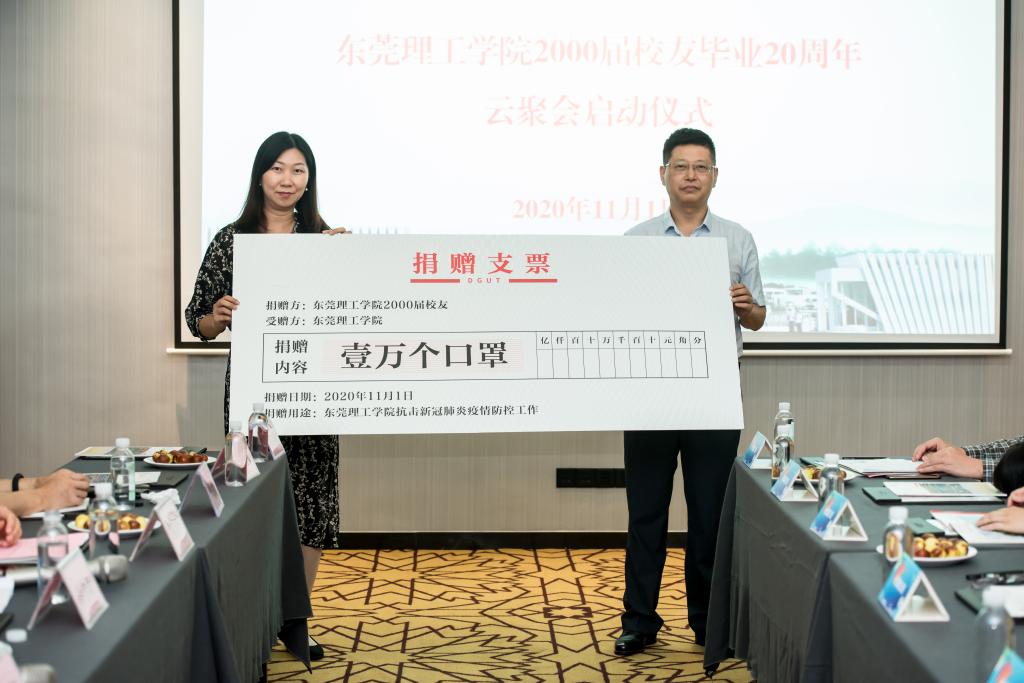 仪式上,校友代表向东莞理工学院捐赠一万只口罩以表对母校新冠肺炎疫情防控工作的大力支持。