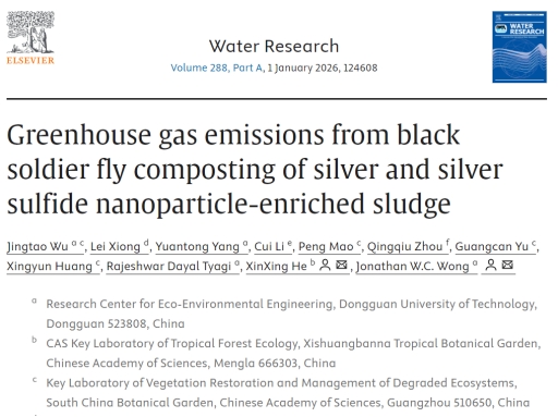 1月,东莞理工学院生态环境工程技术研发中心(简称“生态中心”)科研团队在黑水虻协同污泥资源化处理与温室气体减排研究方面取得重要进展。该研究系统揭示了含银/硫化银纳米颗粒污泥在黑水虻堆肥过程中的温室气体排放规律及其微生物学机制,提出了利用银形态调控黑水虻堆肥过程、降低氧化亚氮和甲烷排放的新思路。相关成果以Greenhouse gas emissions from black soldier fly composting of silver and silver sulfide nanoparticle-enriched sludge为题发表于国际期刊Water Research。东莞理工学院为论文第一完成单位,生态中心吴靖滔副研究员为论文第一作者,中国科学院西双版纳热带植物园何新星副研究员和生态中心Jonathan W.C. Wong教授为论文共同通讯作者。