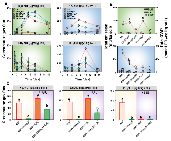 黑水虻堆肥是一种兼具减量化、资源化与高值化潜力的新型污泥处理技术,但其处理过程中可能产生氧化亚氮(N₂O)和甲烷(CH₄)等温室气体,影响绿色低碳应用效果。与此同时,银纳米颗粒广泛应用于医药、化妆品和水处理等领域,进入污水处理系统后多以硫化银纳米颗粒(Ag₂S-NPs)形式富集于污泥中,其在黑水虻堆肥过程中的环境行为及生态效应尚不清楚。针对上述问题,研究团队构建了含银/硫化银纳米颗粒污泥的黑水虻堆肥体系,结合温室气体通量监测、功能基因定量、宏基因组分析及同步辐射表征等手段,系统揭示了银形态转化及其对温室气体排放的影响机制。研究结果表明,黑水虻会增加污泥堆肥过程中N₂O和CH₄排放,而添加Ag-NPs或Ag₂S-NPs后可显著抑制两类温室气体释放。在黑水虻存在条件下,Ag/Ag₂S-NPs使N₂O排放降低51.7%–86.1%,CH₄排放降低44.3%–92.9%,全球增温潜势显著下降。机理分析表明,N₂O减排主要与hao、norB等功能基因受抑及nosZ基因增强有关;CH₄减排则主要与mcrA受抑和pmoA增强有关。进一步研究发现,Ag₂S-NPs在黑水虻肠道中部分转化为AgCl,且生物有效性增强,从而重塑肠道微生物群落并抑制反硝化和产甲烷代谢过程。该研究阐明了含银污泥在黑水虻堆肥过程中的温室气体减排机制,为污泥低碳资源化利用和新污染物风险管理提供了理论依据。